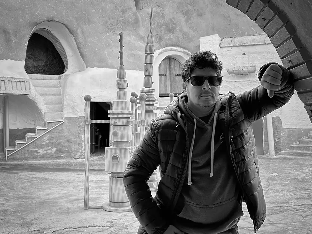 Standing in the troglodyte house in Matmata, southern Tunisia, the real set used as Anakin Skywalker's home in Star Wars.